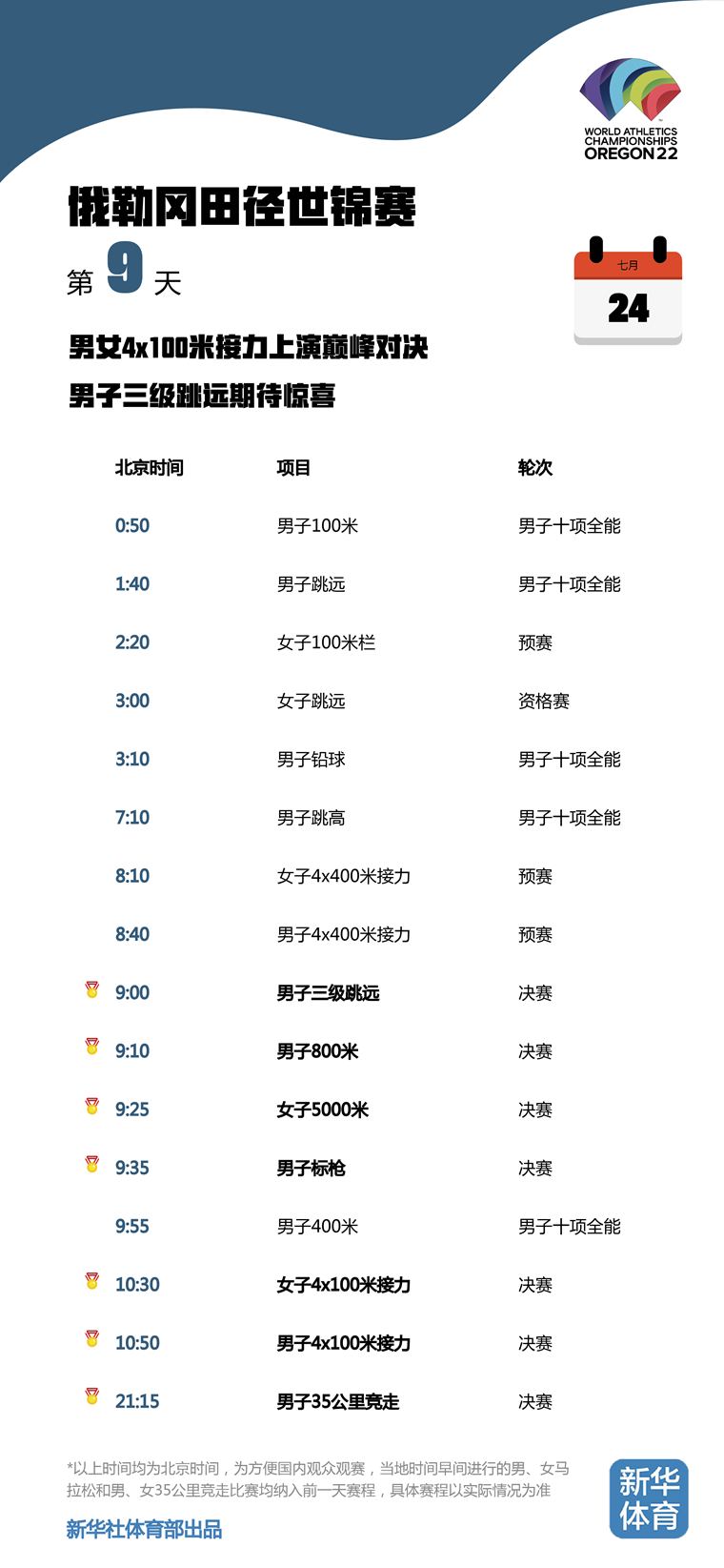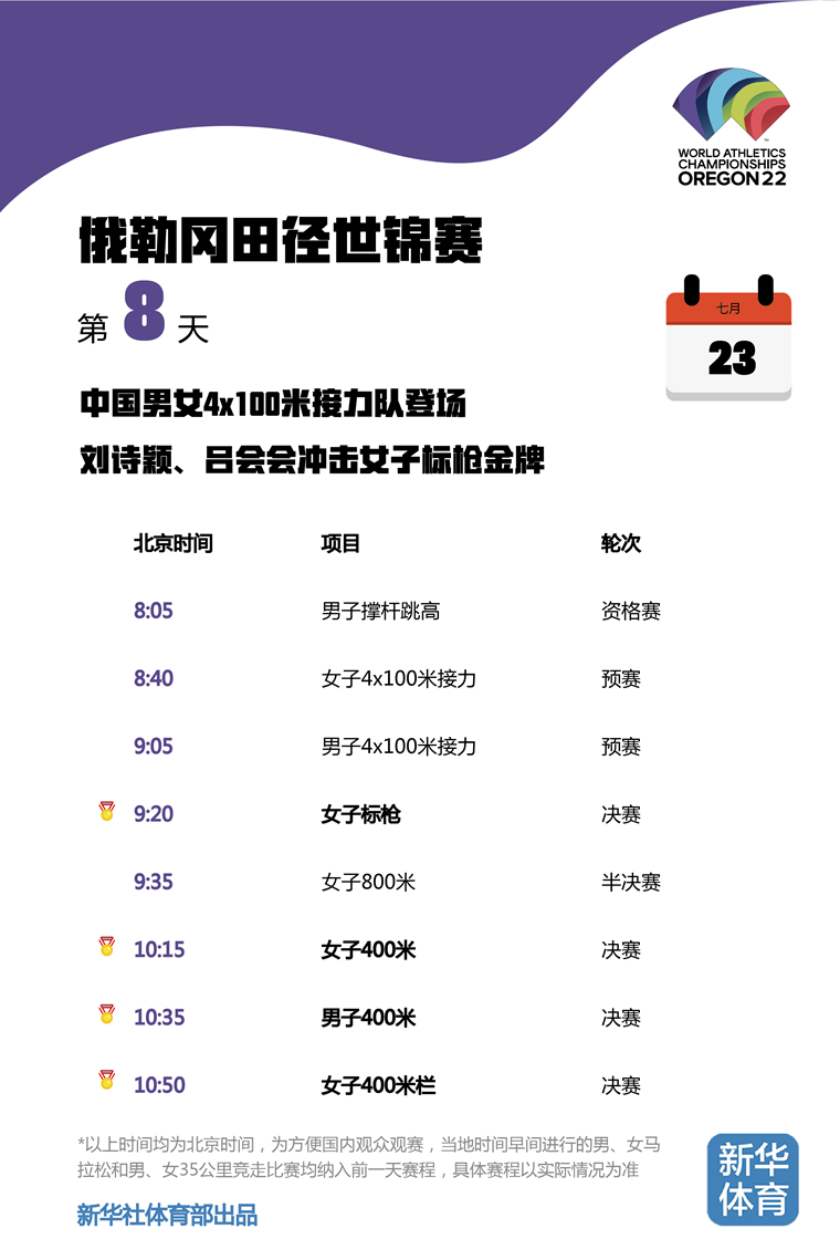 2022俄勒冈田径世锦赛将于当地时间7月15日至24日在美国俄勒冈州尤金市举行。由于比赛地与北京有15个小时的时差,为方便国内观众观赛,新华体育的小编们特意按照北京时间整理了一份世锦赛每日观赛时间表。日期、比赛时间统统都是北京时间!不用再去掰着手指头算时差,苏炳添、巩立姣等中国队名将每一轮比赛全部一目了然,快快收藏吧!