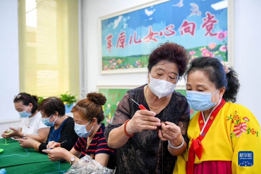 内蒙古赤峰市兴安街道临潢家园社区居民柳桂侠(右二)为民族技艺传承班的学员讲解编织技巧(2021年8月31日摄)。新华社记者 贝赫 摄