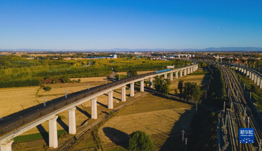 这是在内蒙古呼和浩特拍摄的运煤专列(2021年10月15日摄,无人机照片)。新华社发(夏亮 摄)
