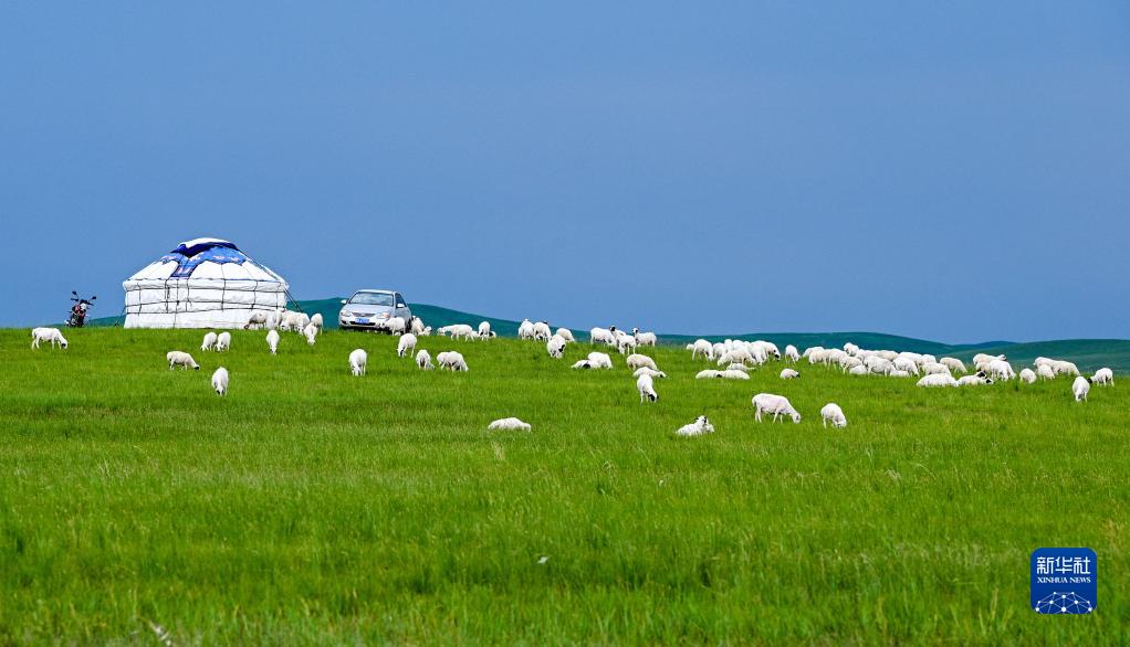 羊群在内蒙古锡林郭勒盟的草原上觅食(2021年7月15日摄)。新华社记者 连振 摄