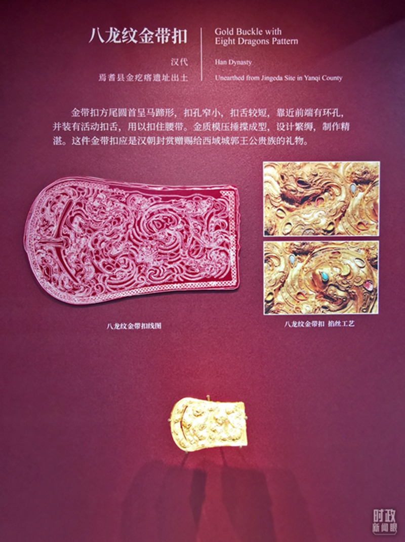 △八龙纹金带扣,新疆汉代出土文物。(总台央视记者李晓周拍摄)