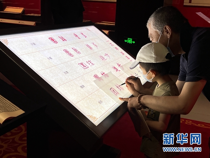 观众在展览现场体验临摹作品。新华网 王頔摄