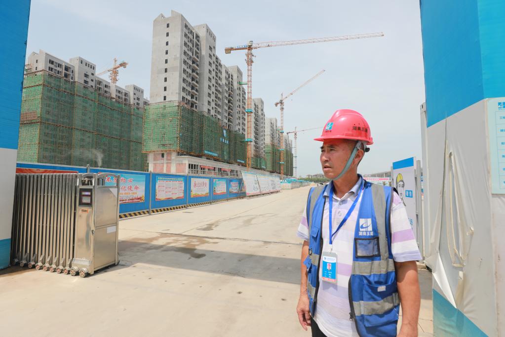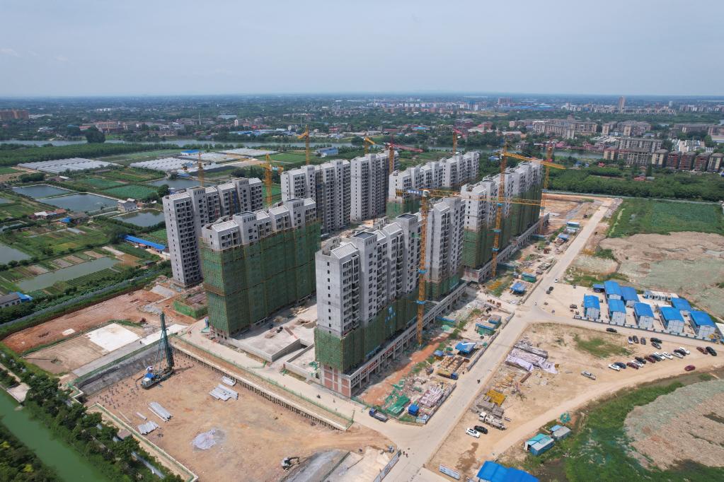 湖南省沅江市的渔民新村,10栋17层电梯房已经封顶,正在建设的6栋大楼周边,塔吊林立,工程车辆往返,工人们正热火朝天地干着活儿。
