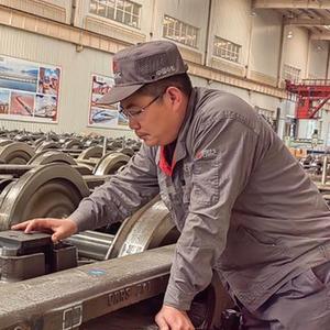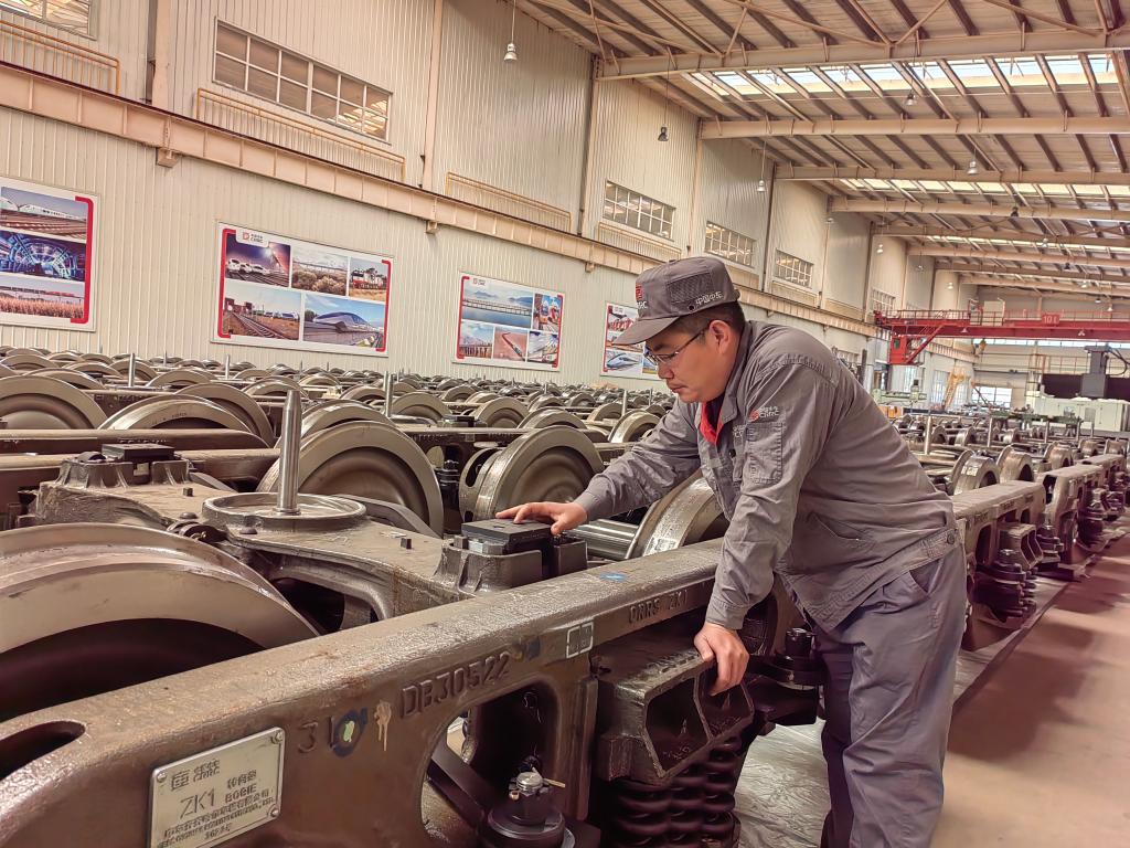 在中车齐车集团齐车公司起重机分公司的车间内,数控加工专业指导师李松正在检查铁路货车转向架。