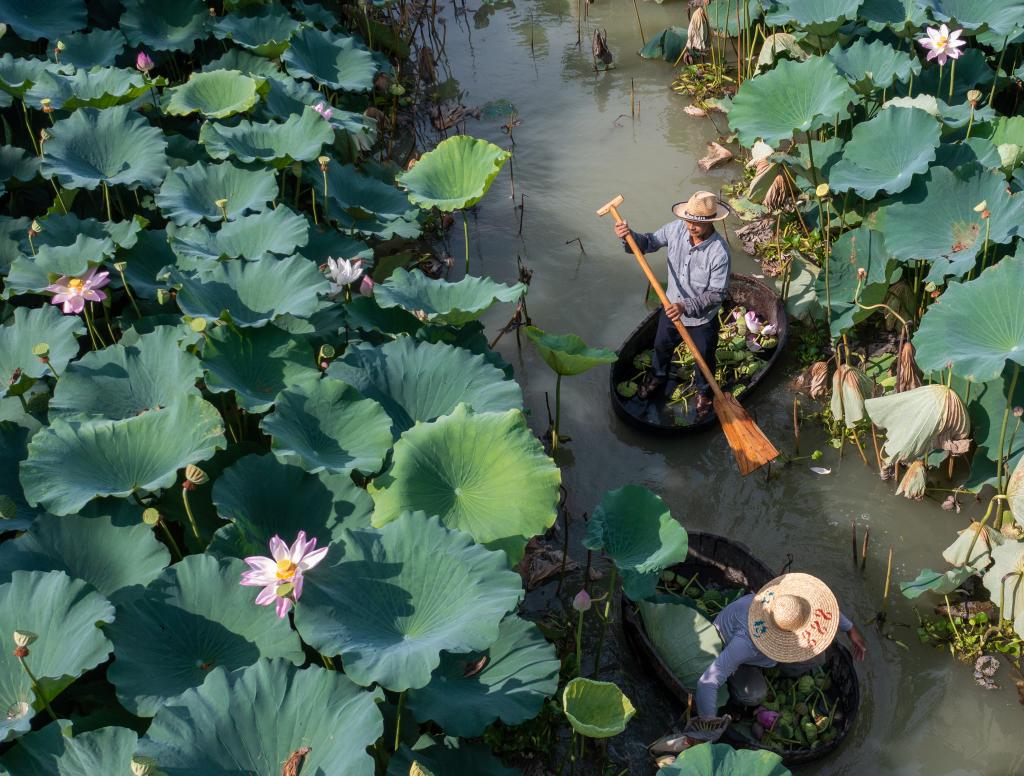 7月21日,浙江省湖州市吴兴区东林镇泉心村的村民划着菱桶采摘莲蓬与荷花(无人机照片)。新华社记者徐昱摄