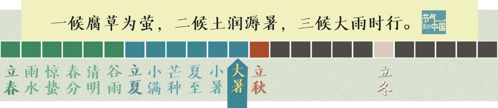 大暑分为三候:“一候腐草为萤,二候土润溽暑,三候大雨时行。”这一时节,天气变得闷热,土地变得潮湿,常常出现暴风骤雨。有趣的是,此时枯草上的萤火虫卵化虫而飞,所以古人误认为萤火虫是腐草变成的。