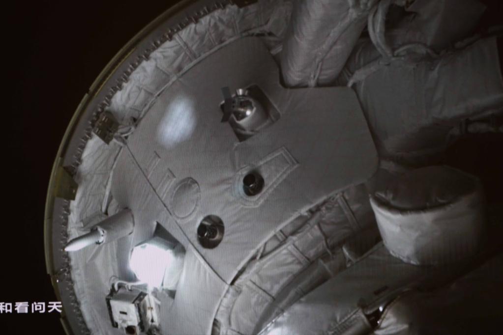 7月25日在北京航天飞行控制中心拍摄的问天实验舱与空间站组合体交会对接。这是问天实验舱成功对接于天和核心舱前向端口。新华社记者 郭中正 摄