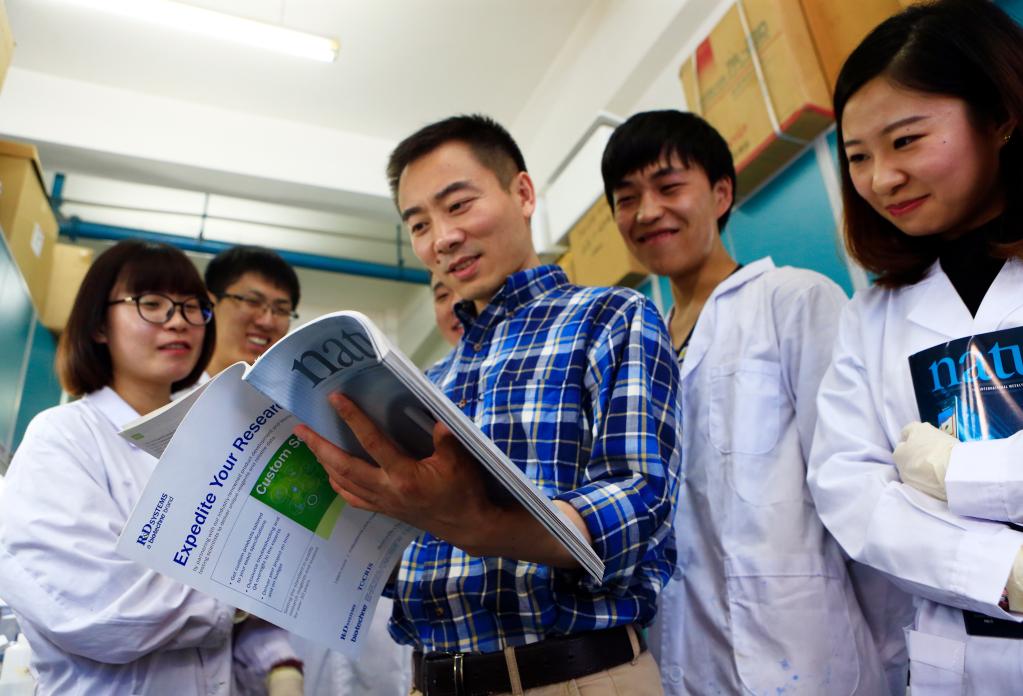 哈尔滨工业大学生命科学与技术学院教授黄志伟带领学生翻阅学术杂志(2017年4月27日摄)。