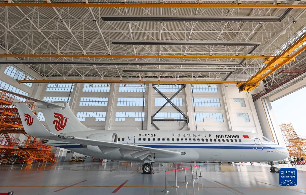 7月29日,以租赁形式正式交付的ARJ21支线飞机停放在天津滨海国际机场的机库内。新华社记者 赵子硕 摄