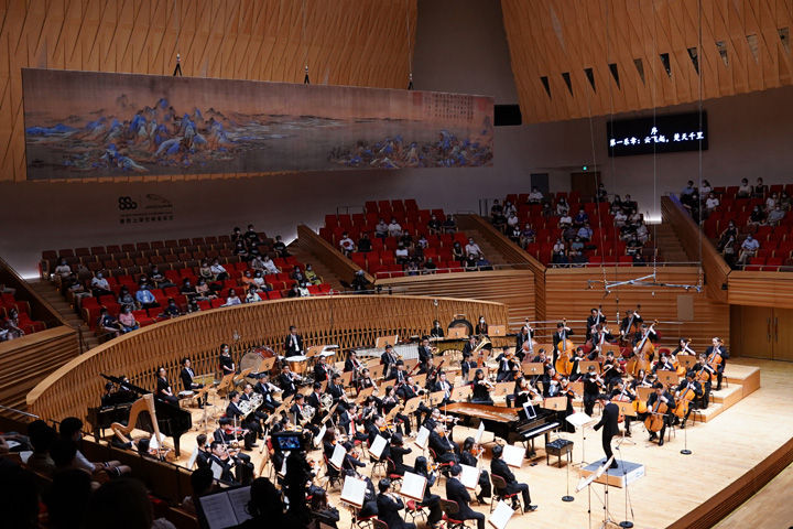 交响音诗《千里江山》首演现场,悬挂着“复刻”的大型《千里江山图》。管弦乐队与笙、琵琶、二胡、钢琴、竹笛等多件独奏乐器相继展开“对话”,加之民族女高音的“点睛”,唱响中西合璧的国乐之声。