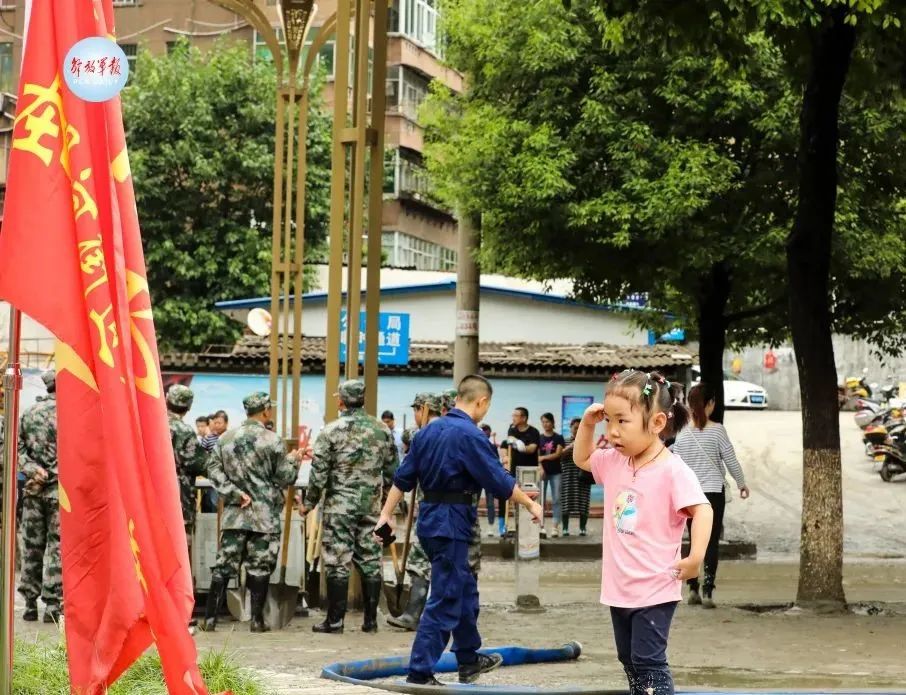 抗洪抢险现场,武警汉中支队官兵和驻地救援力量在县城广场开展排水、清淤工作。当地一位母亲带着女儿来到武警官兵休息点,送上水和面包慰问子弟兵。慰问间歇,小女孩在武警汉中支队的队旗前敬了一个稚嫩又可爱的军礼。