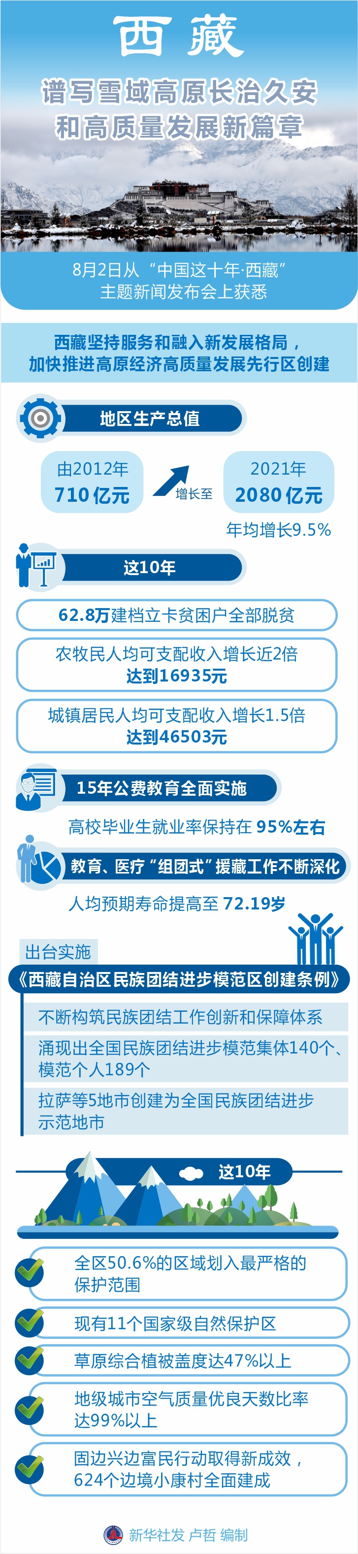 王君正介绍,西藏坚持服务和融入新发展格局,加快推进高原经济高质量发展先行区创建,地区生产总值由2012年710亿元增长至2021年2080亿元,年均增长9.5%,清洁能源、高新数字、文化旅游等“七大产业”快速发展。这10年,西藏62.8万建档立卡贫困户全部脱贫,农牧民人均可支配收入增长近2倍、达到16935元,城镇居民人均可支配收入增长1.5倍、达到46503元;15年公费教育全面实施,高校毕业生就业率保持在95%左右,教育、医疗“组团式”援藏工作不断深化,人均预期寿命提高至72.19岁。
