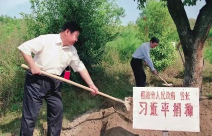 △2001年10月,习近平在福建省龙岩市长汀县调研水土流失治理工作,在河田世纪生态园为他捐种的香樟树培土。(图源:《习近平在福建》)
