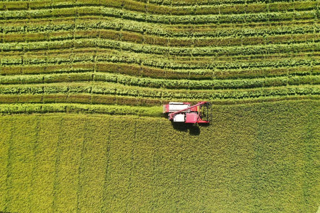 8月6日,在湖南省常德市澧县梦溪镇梦溪寺社区,农民驾驶收割机收获再生水稻(无人机照片)。新华社发(柏依朴摄)