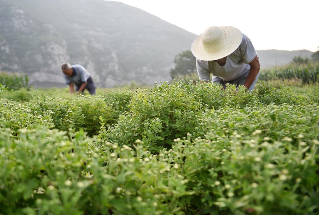 8月6日,河北省石家庄市井陉县张家洼村的农民在种植中药材的田里锄草。新华社发(张晓峰摄)