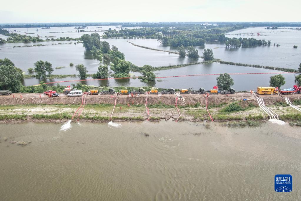 8月7日,抢险人员在辽宁盘锦绕阳河左岸曾经的河堤溃口北段进行排涝作业(无人机照片)。新华社记者 潘昱龙 摄