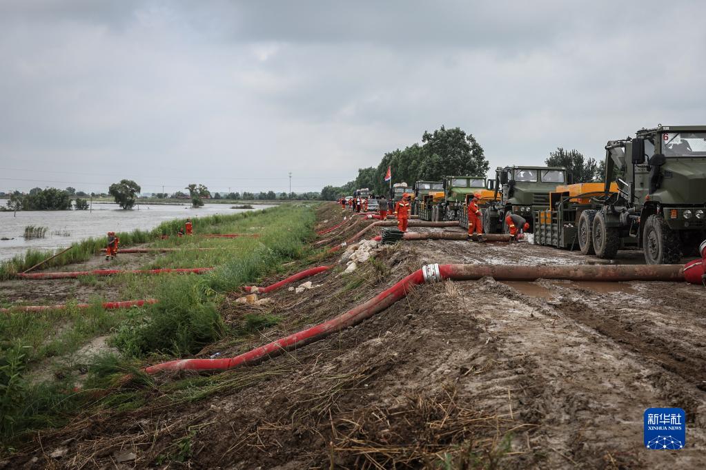 8月7日,抢险人员在辽宁盘锦绕阳河左岸曾经的河堤溃口北段进行排涝作业。新华社记者 潘昱龙 摄