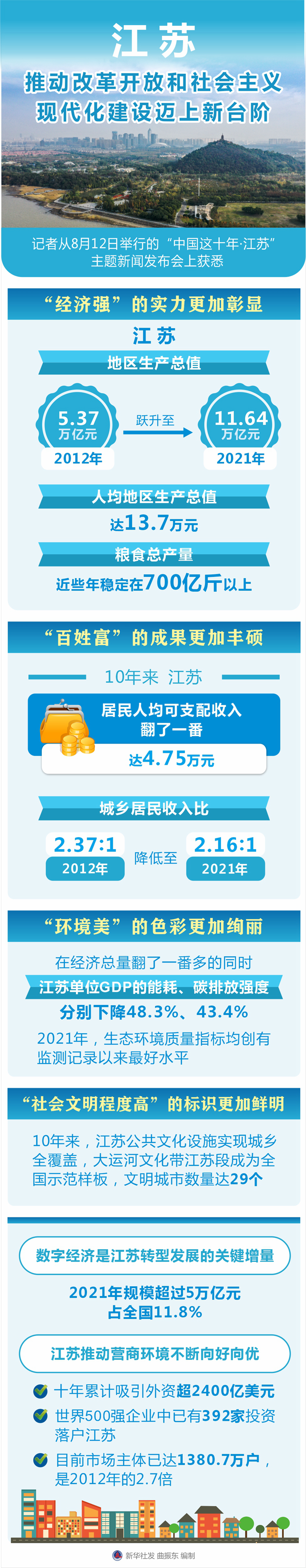 新华社南京8月12日电(记者陈刚)记者从12日举行的“中国这十年·江苏”主题新闻发布会上获悉,党的十八大以来,江苏沿着习近平总书记指引的方向踔厉奋发、勇毅前行,努力推动改革开放和社会主义现代化建设迈上新台阶。