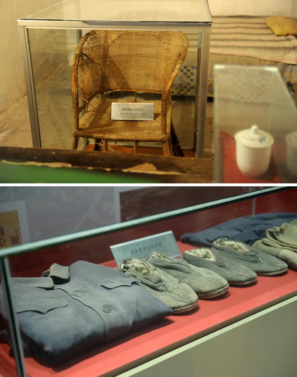 ↑在兰考焦裕禄纪念馆内拍摄的焦裕禄的藤椅(上)和衣物(下)。