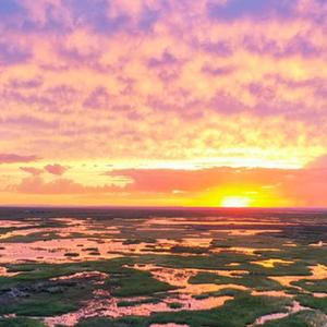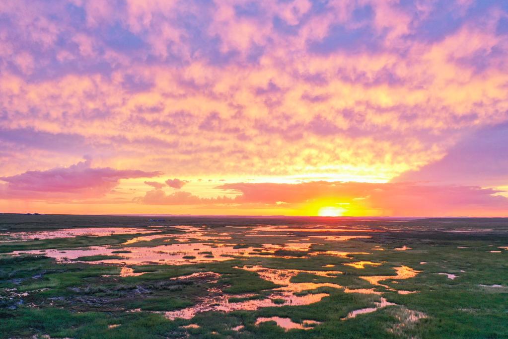 这是2022年7月27日在内蒙古东乌珠穆沁旗拍摄的夕阳下的草原(无人机照片) 新华社记者 刘磊 摄