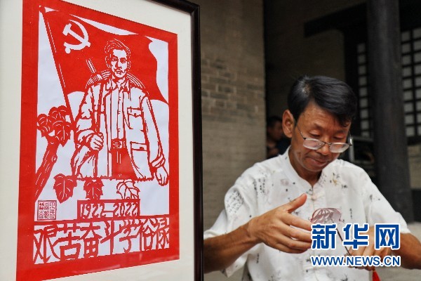 图为第四批非物质文化遗产保护项目丁氏剪纸艺术的代表性传承人丁军科和他的剪纸作品《艰苦奋斗学裕禄》。(文字/汪亚 摄影/范作言)