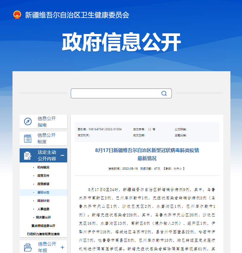 8月17日新疆维吾尔自治区新型冠状病毒肺炎疫情最新情况