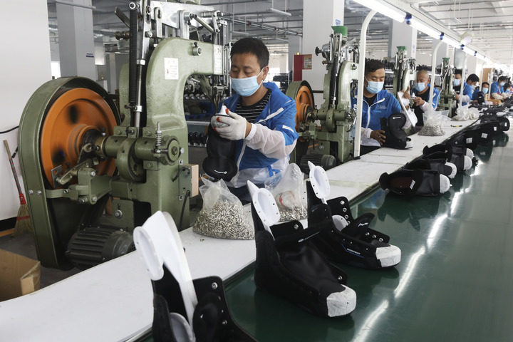 7月7日,在张家口高新区冰雪运动装备产业园,工人在一家冰球鞋生产企业车间工作。新华社发(武殿森 摄)