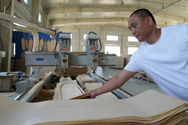 8月4日,在穆棱经济开发区,黑龙江劲道冰雪装备项目生产车间工人进行生产作业。新华社记者 王建威 摄