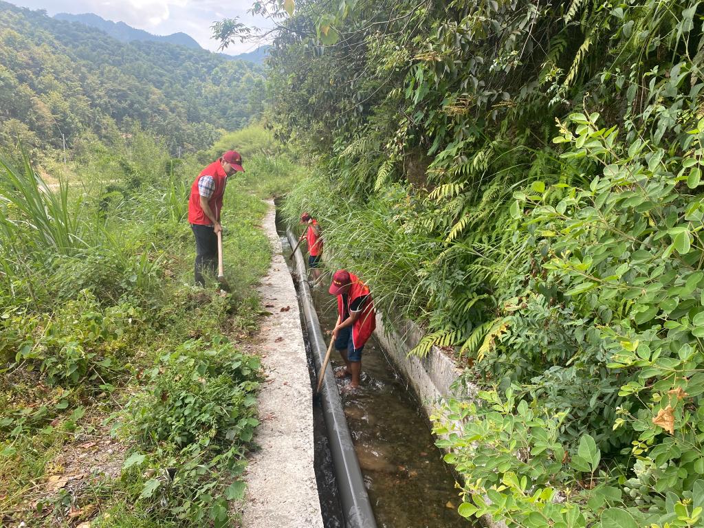 8月16日,在新邵县坪上镇颜岭水库附近,当地干部群众正在疏通灌渠保畅。(受访者供图)