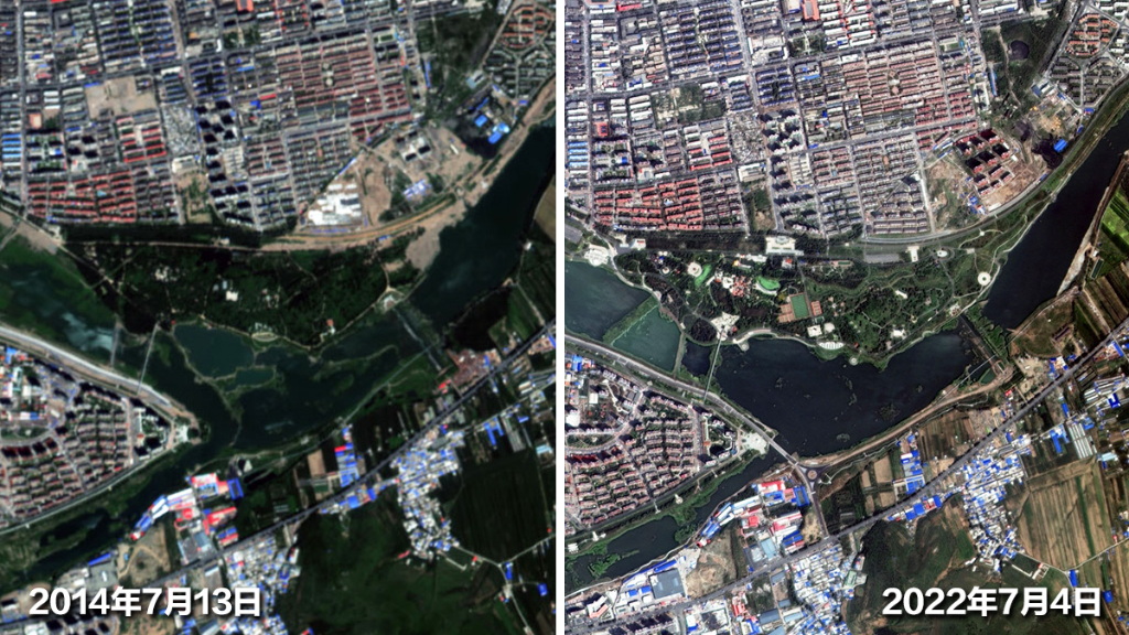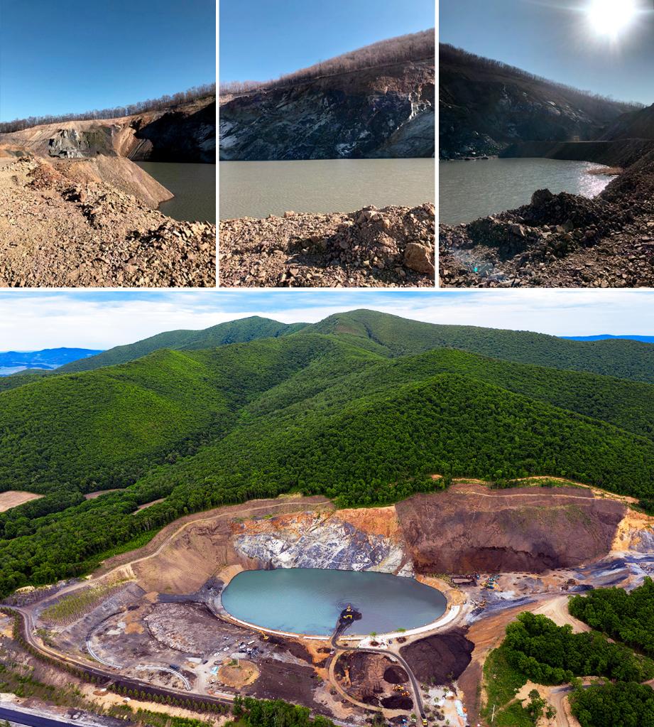 拼版图片:上图为黑龙江省宝清县翡翠湖矿坑森林公园的前身——一处废弃矿坑(2019年5月摄);下图为2022年6月17日,正在施工的翡翠湖矿坑森林公园项目工地(无人机照片,新华社记者 谢剑飞 摄)。