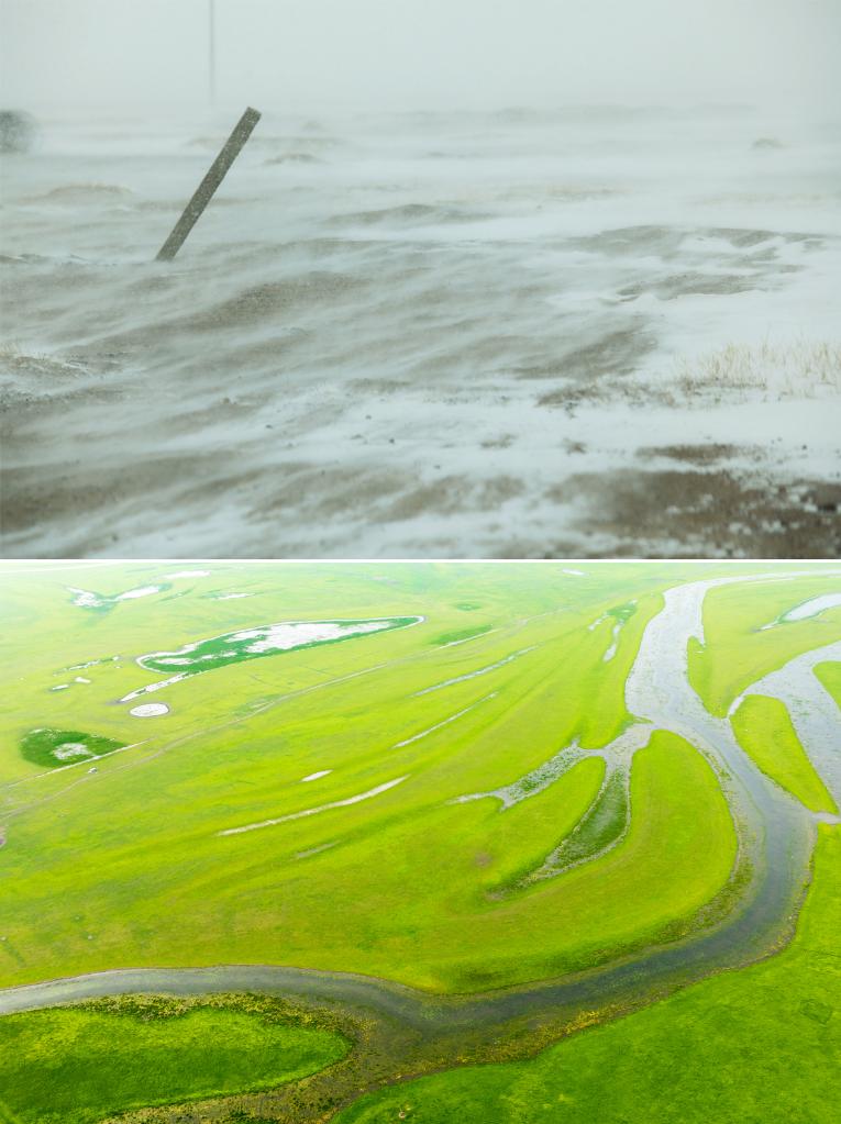 拼版图片:上图为2010年3月15日,在吉林省白城市镇赉县建平乡大岗村拍摄的盐碱地上的“白毛风”(潘晟昱 摄);下图为2022年6月20日无人机拍摄的镇赉县嫩江湿地(新华社记者 张楠 摄)。