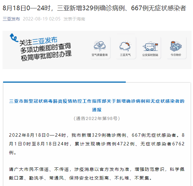 2022年8月18日0—24时,我市新增329例确诊病例、667例无症状感染者。8月1日0时至8月18日24时,累计发现确诊病例4722例、无症状感染者6762例。