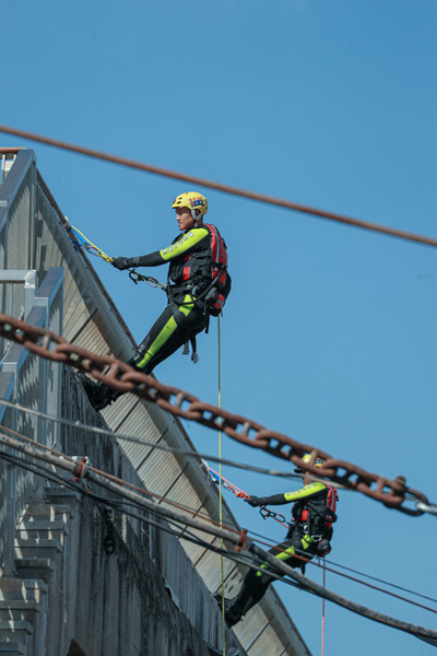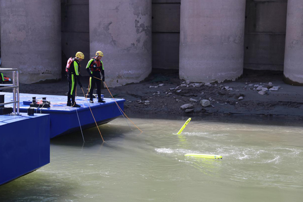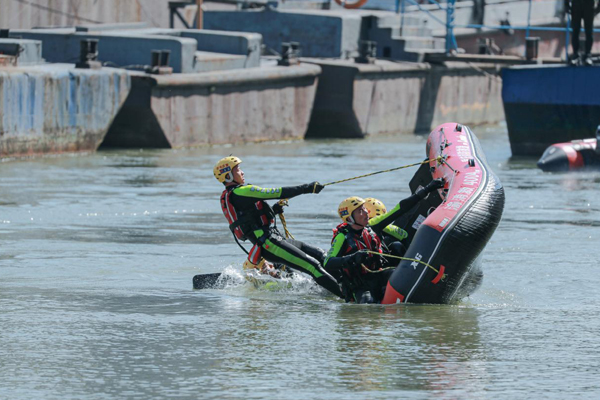 演练当天,多名水域救援“尖兵”身着湿式救援服,驾驶冲锋舟、突降绳索、深潜搜寻,开展水面机器人救生、桥降救援、舟艇离心救援、翻舟扶正、潜水救援等水域搜救项目演练。