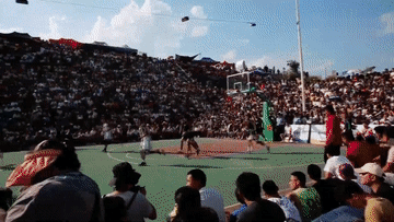 红绿配色作底的篮球场被围得水泄不通