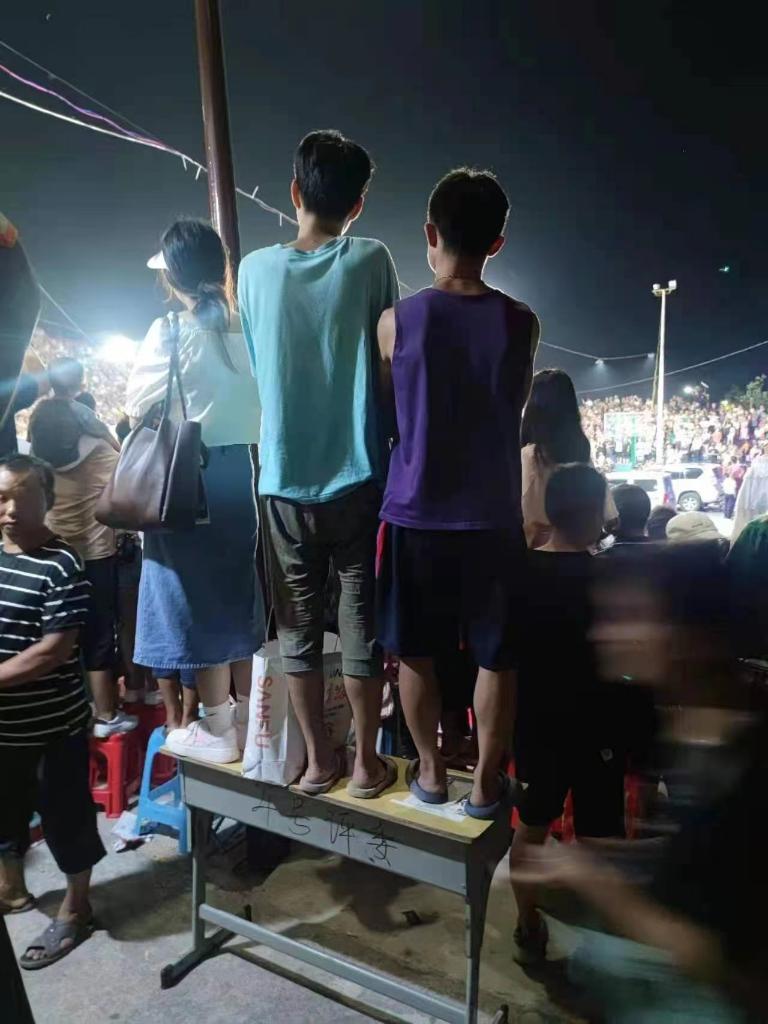 ⬆比赛现场,群众站在桌子上观赛⬆