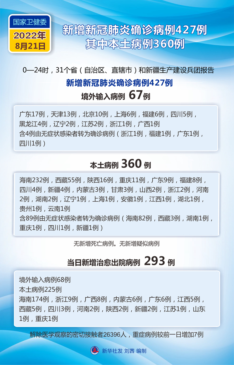 新华社北京8月22日电 国家卫生健康委员会8月22日通报,8月21日0至24时,31个省(自治区、直辖市)和新疆生产建设兵团报告新增新冠肺炎确诊病例427例。其中境外输入病例67例(广东17例,天津13例,北京10例,上海6例,福建6例,四川5例,黑龙江4例,辽宁2例,江苏2例,浙江1例,广西1例),含4例由无症状感染者转为确诊病例(浙江1例,福建1例,广东1例,四川1例);本土病例360例(海南232例,西藏55例,陕西16例,重庆11例,广东9例,福建8例,四川4例,新疆4例,内蒙古3例,甘肃3例,山西2例,浙江2例,河南2例,湖南2例,辽宁1例,上海1例,安徽1例,江西1例,湖北1例,贵州1例,云南1例),含89例由无症状感染者转为确诊病例(海南82例,西藏3例,湖南1例,重庆1例,四川1例,新疆1例)。无新增死亡病例。无新增疑似病例。