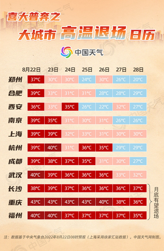 而在近期高温最为顽固的四川东部、重庆一带,高温退场的速度虽然有些慢,但强度还是有所减弱的。像是重庆本周最高气温也会从43℃降到36℃左右,但预计一直要到本月底,当地高温才有望得到缓解。