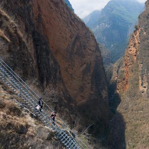 2020年5月13日,四川省凉山彝族自治州昭觉县支尔莫乡“悬崖村”——阿土列尔村高山区的贫困户沿着钢梯下山,准备搬进昭觉县城易地扶贫搬迁安置点的新家(无人机照片)。新华社记者 江宏景 摄