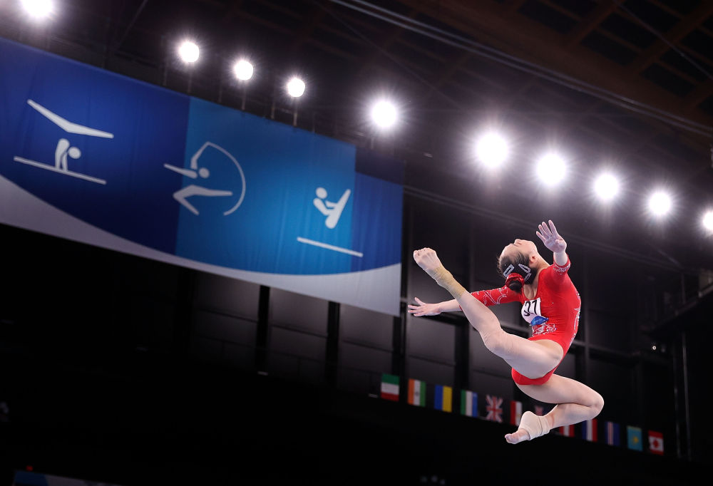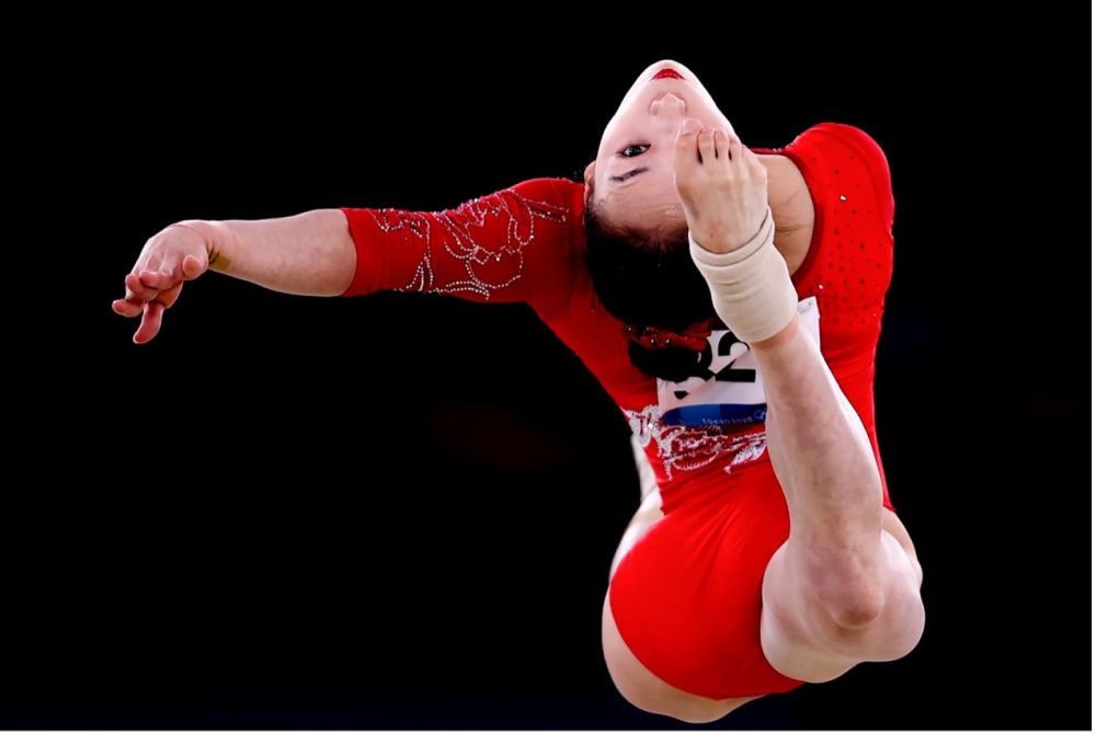 2021年7月25日,中国选手章瑾在自由操比赛中。当日,东京奥运会体操女子资格赛在日本东京有明体操体育馆进行。新华社记者 曹灿 摄