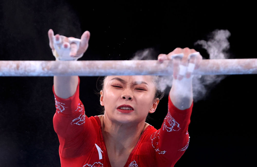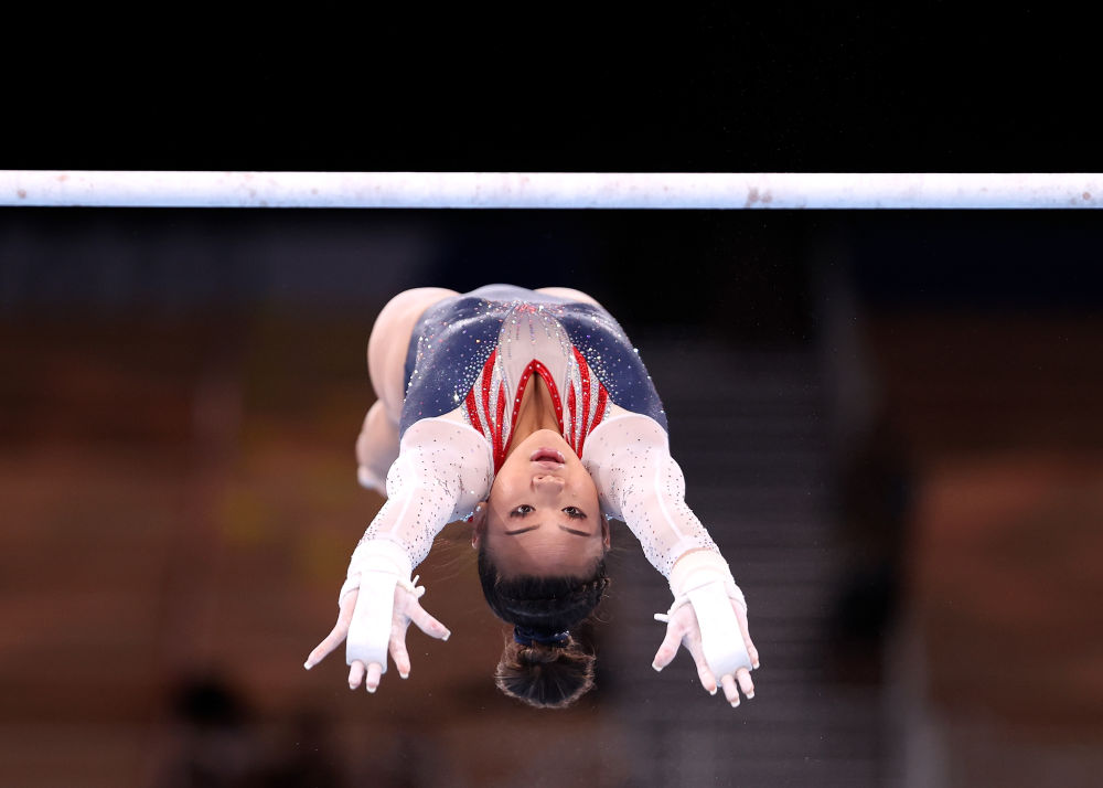 2021年7月29日,美国选手苏妮莎·李在高低杠比赛中。当日,东京奥运会体操女子个人全能决赛在东京有明体操体育馆举行。新华社记者 曹灿 摄
