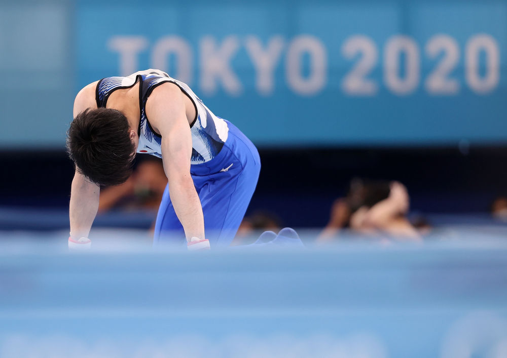 2021年7月24日,日本选手内村航平在比赛中失误。当日,2020东京奥运会体操男子资格赛在东京有明体操体育馆举行。新华社记者曹灿摄