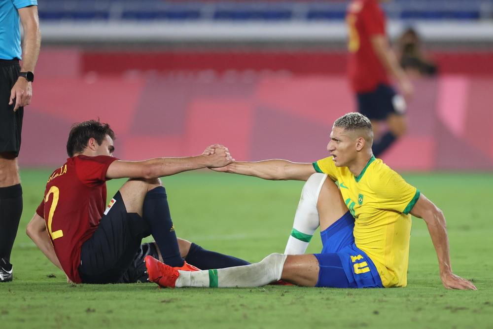 2021年8月7日,巴西队球员理查利森(右)与西班牙队球员加西亚在比赛中相互搀扶起身。新华社记者 曹灿 摄