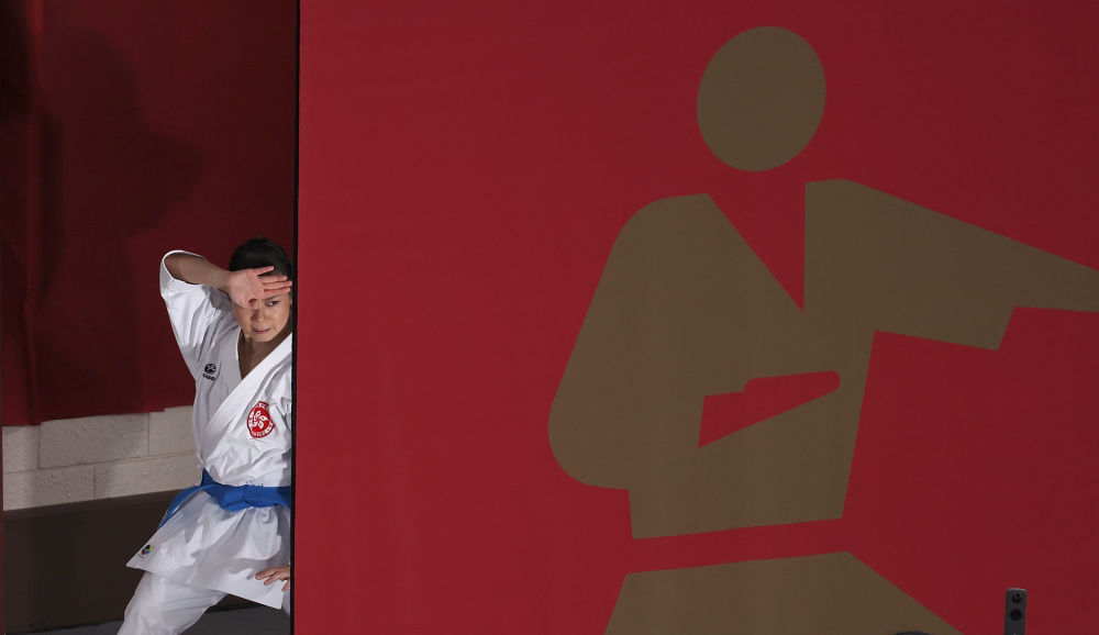 2021年8月5日,中国香港选手刘慕裳在空手道女子型比赛前,在场边练习。新华社记者 曹灿 摄