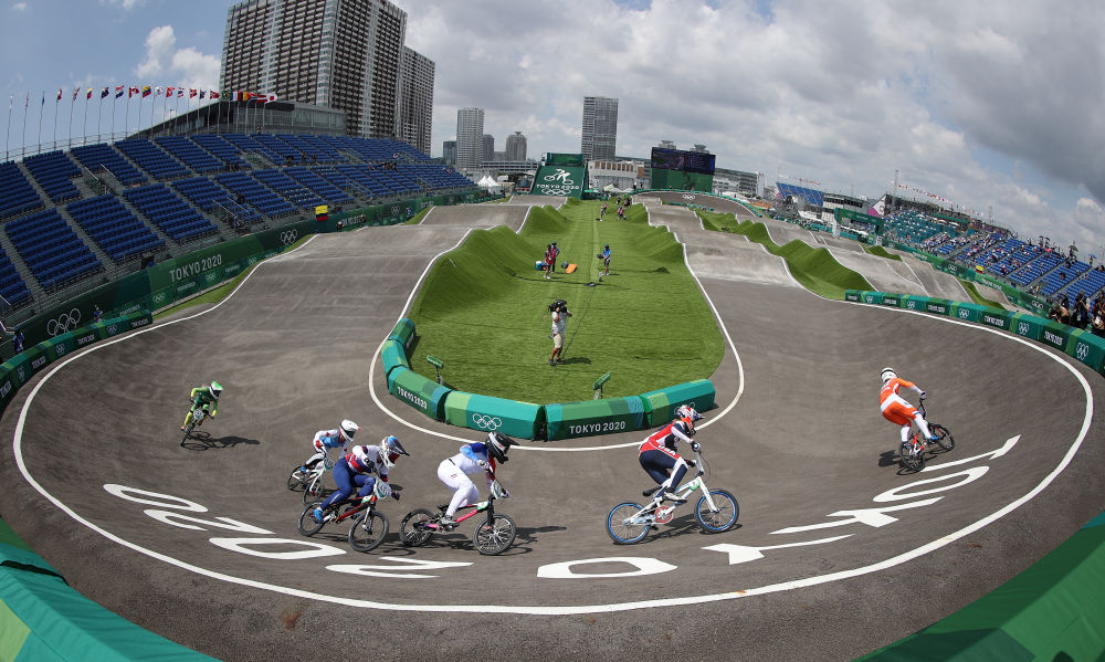 2021年7月29日,参赛选手在比赛中。当日,东京奥运会BMX小轮车竞速赛在有明城市体育公园开赛。新华社记者 曹灿 摄