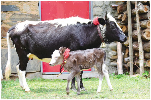 村民平措家的阿沛甲咂牛母牛及其刚生下5天的小牛。本报记者刘诗平摄