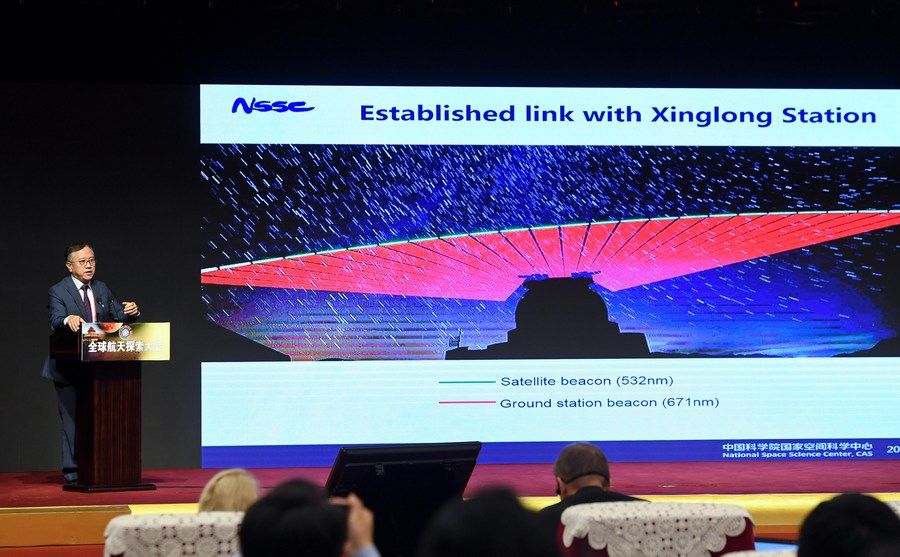 吴季在2017年全球航天探索大会上作题为《中国空间科学卫星计划》的报告。新华社记者 陈晔华 摄