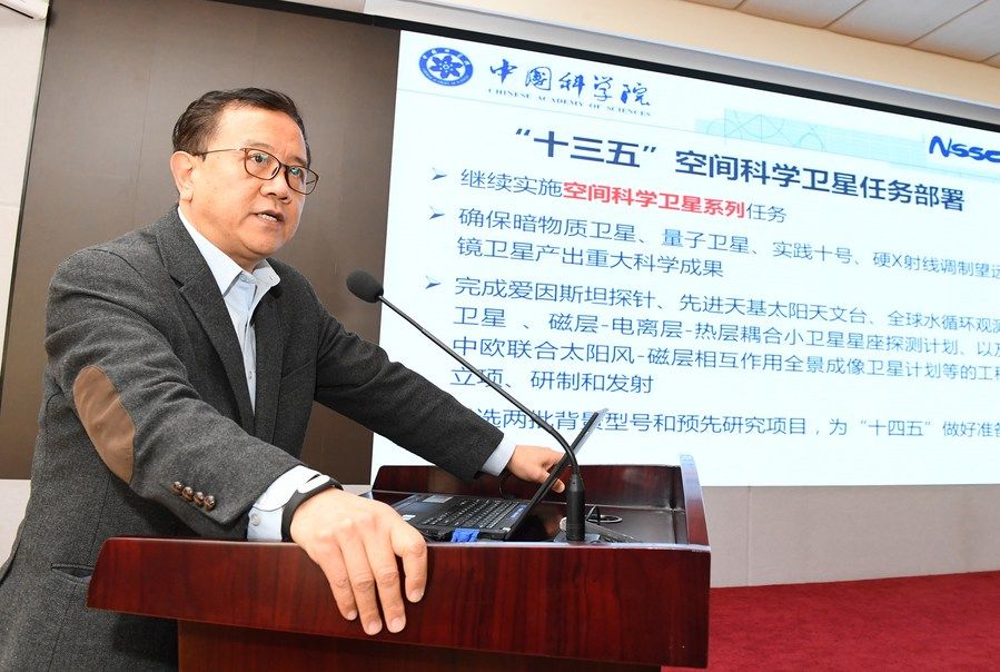 2016年12月1日,中科院全面启动“十三五”空间科学任务,向全国征集“任务单”。时任国家空间科学中心主任的吴季在发布会上介绍情况。新华社记者 李贺 摄