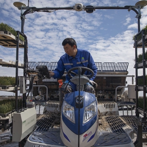 2021年5月11日,工作人员操作无人驾驶插秧机准备作业。