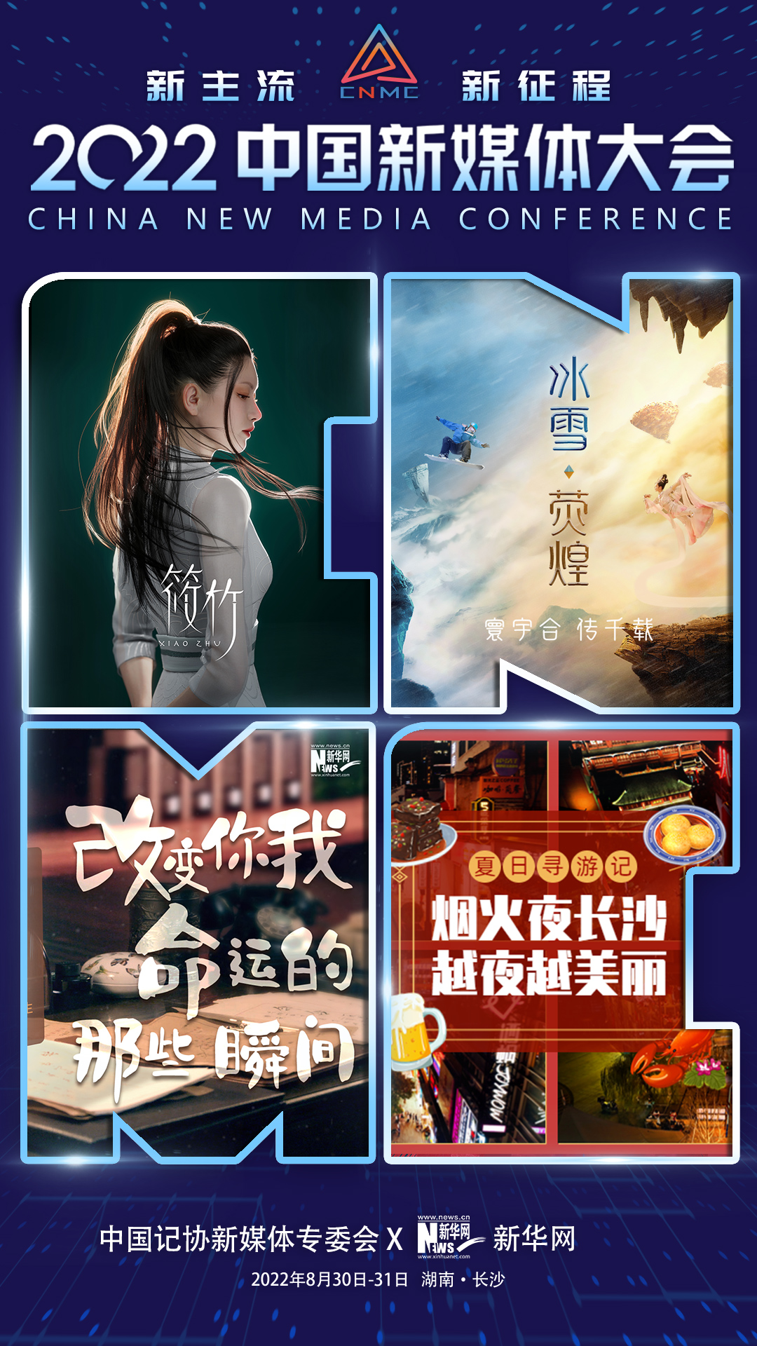 2022中国新媒体大会将于8月30日-31日在湖南长沙召开,中国记协新媒体专业委员会联合新华网推出“联名海报”为大会预热。海报以中国新媒体大会英文缩写字母——“CNMC”幻化为“视窗”意象,生动展现新华网记者编辑采访报道、现场直播和演播厅制作的场景,呈现新华网媒体融合发展成果。
