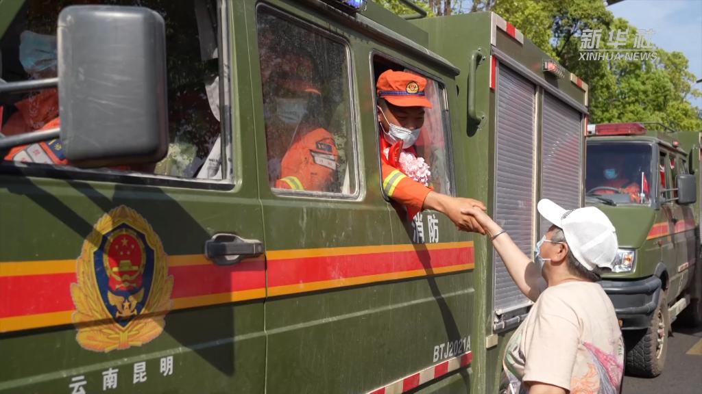 28日上午,增援重庆的云南森林消防指战员撤离重庆,他们是北碚火场的攻坚力量。队伍撤离时不到3公里的路程,消防队走了近一个小时。重庆市民夹道欢送。